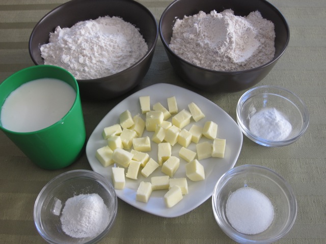 - Sift the flours, baking powder, baking soda (bicarbonate of soda) and salt into a bowl ((return the husks from the whole wheat flour into the bowl). Using your fingertips, rub in the butter until the mixture resembles coarse breadcrumbs. Form a well in the centre and add the buttermilk into the well. Mix with a flat bladed knife, until the dough forms (the dough should be slightly sticky not dry).