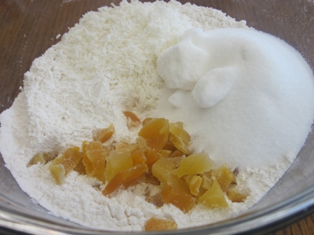 - Sift together the flour, baking powder and salt in a bowl. Stir in coconut. sugar and mango. Make a well in the centre.