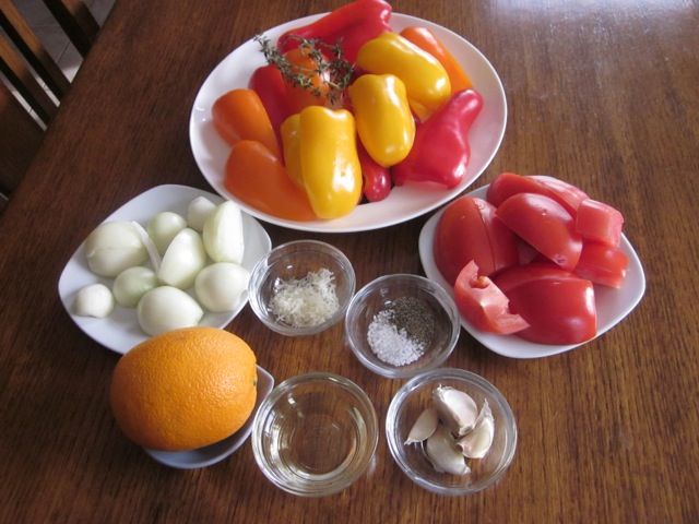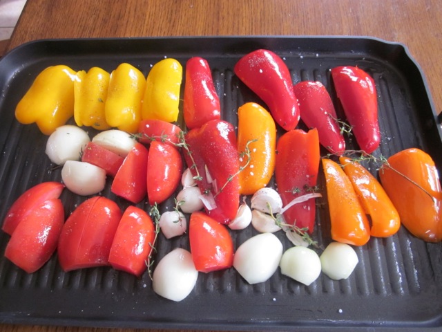 Roasted Pepper and Orange Soup myfavouritepastime.com_1406 Place the onion, garlic, peppers, tomatoes and thyme sprigs in a roasting pan. Drizzle the oil over the vegetables and mix well, then arrange the vegetables in a single layer, skin side up. Roast for about 20 minutes then flip over and roast a further 5 minutes, until slightly charred. Meanwhile bring the stock to a boil.