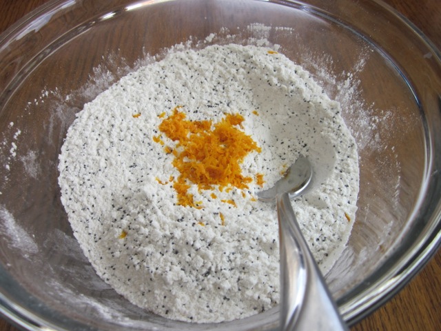 1. Sift the flour, baking powder, sugar and poppy seeds into a bowl. Stir in the orange rind and make a well in the centre.