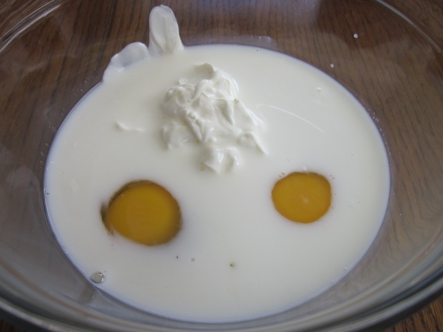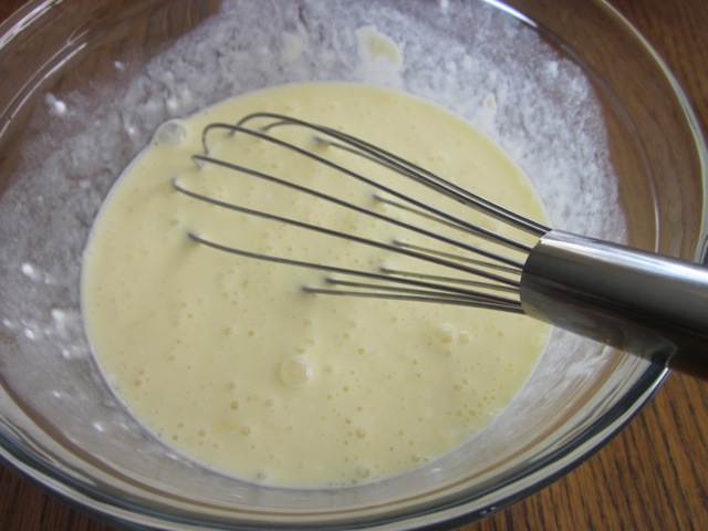 2. In another bowl, whisk together the eggs, sour cream and milk and pour into the well. Mix with a wooden or metal spoon until just smooth. Add more milk, if necessary, until the batter has a dropping consistency.