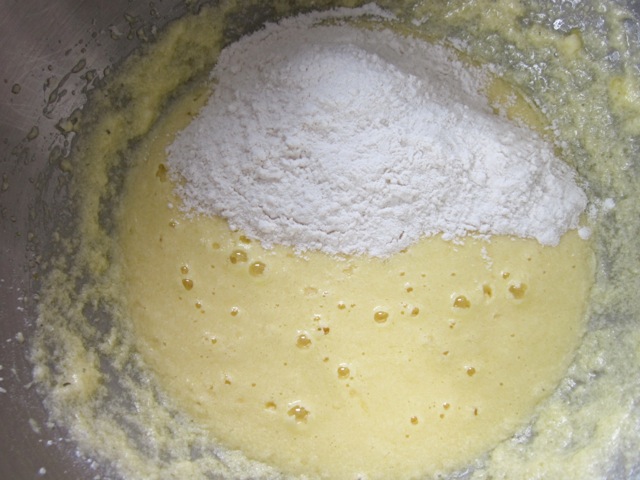 - Beat butter and sugar in a bowl with an electric mixer until light and fluffy. Beat in one egg at a time with a teaspoon of flour.
