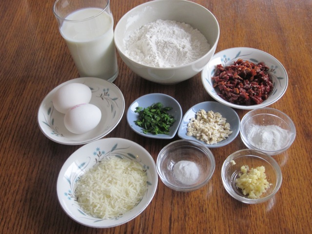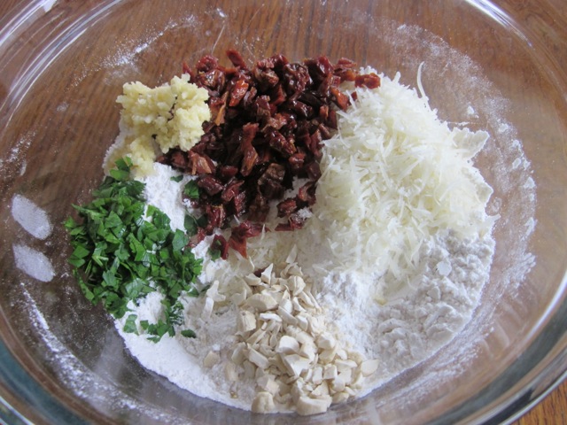 1. Sift the flour, baking powder, baking soda, salt and pepper into a bowl. Add the sundried tomatoes, basil (or parsley), nuts, garlic and Parmesan, stir to combine, and make a well in the centre.