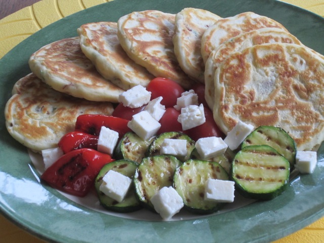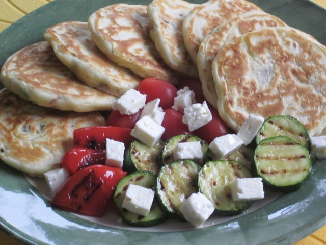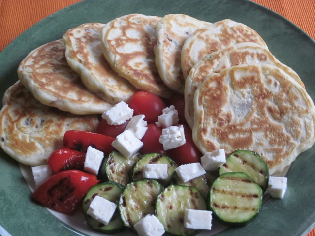 Sundried Tomato Pikelets myfavouritepastime.com_1518Serve. I served mine with some roasted veggies and Feta cheese, for a light lunch