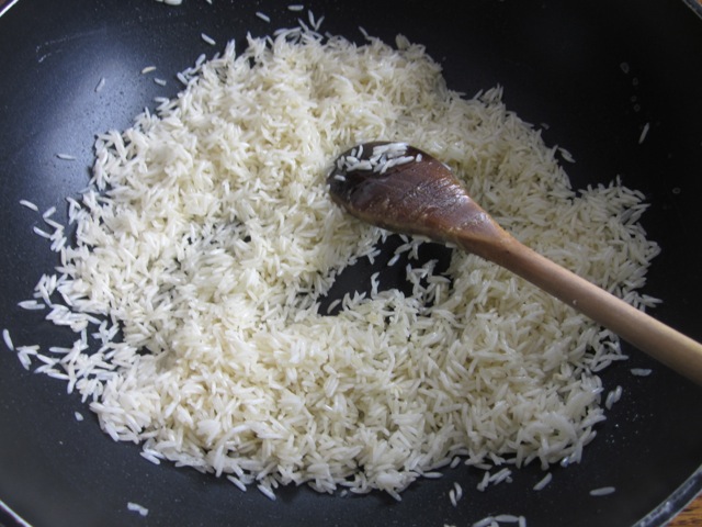 Basmati Rice with Spinach and Parmesan myfavouritepastime.com_2019Heat butter and olive oil in a non-stick pot. Add rice and stir and fry for about 5 minutes until fully coated with oil. Add the stock, season, if necessary, and bring to a rolling boil, reduce heat and simmer for 12 minutes without lifting the lid. Turn off the heat and let stand for 10 minutes, without lifting the lid.