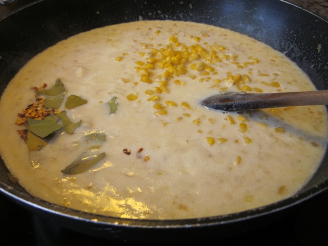 Cream of Sweet Corn Soup myfavouritepastime.com_1167then gradually add 3 cups milk, stirring constantly. Bring to the boil, add sweet corn, bay leaf, salt and pepper to taste and chilli flakes (if using) and bring back to the boil. Cover, reduce heat and simmer for 15-20 minutes, until potatoes are cooked.