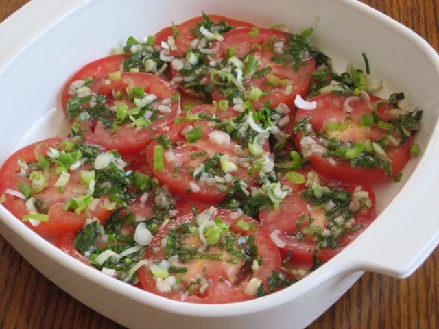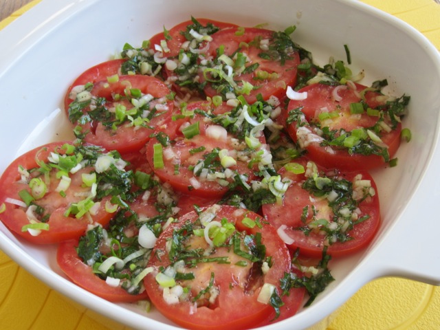 Tomato Salad with Fresh Herbs myfavouritepastime.com_1681Arrange sliced tomatoes in a single layer on a plate. Sprinkle some green onions on top. Drizzle dressing over the layer. Add another layer of tomatoes, sprinkle green onions and drizzle dressing over the layer of tomatoes. Continue layering until tomatoes are finished.