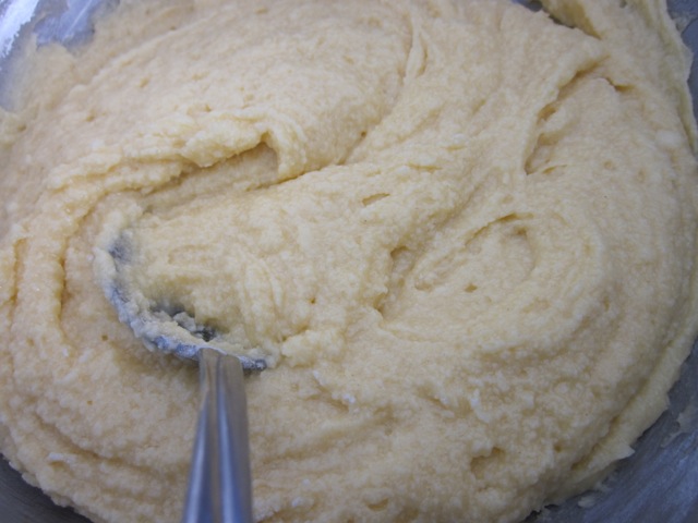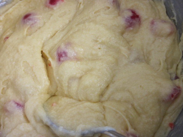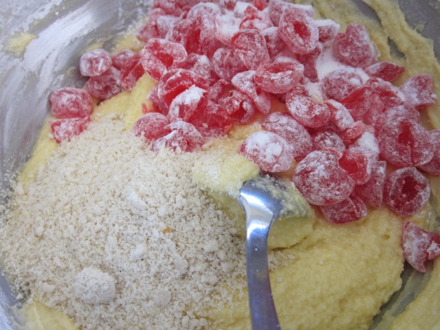 Fold in the ground almonds and the chopped cherries and mix lightly to distribute the cherries evenly. If the batter is a bit thick, add two tablespoons of the tepid water to give the mixture a dropping consistency.