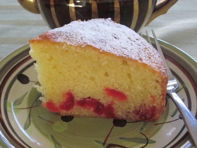 The cake looks delicious even though the cherries sunk to the bottom. 🙂