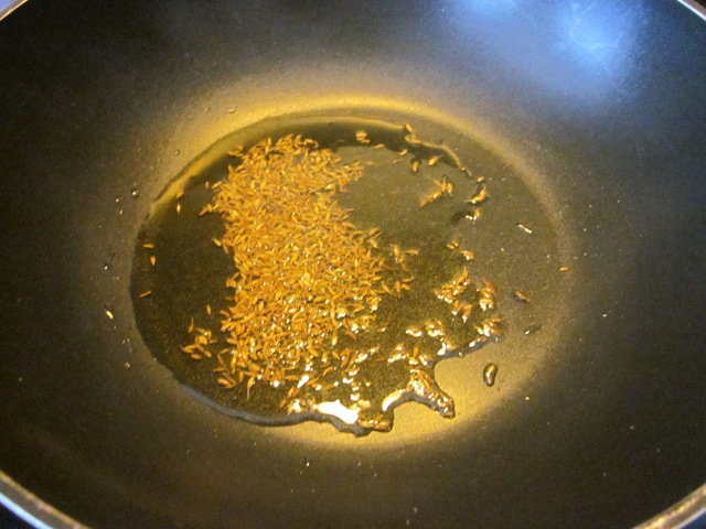 Heat the oil over medium heat and fry the cumin seeds until they pop,