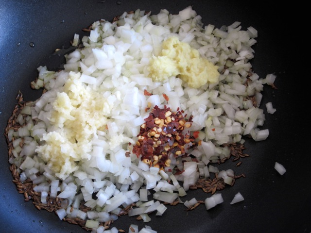 - Heat the oil over medium heat and fry the cumin seeds until they pop, then add the onions, ginger, garlic and finely chopped chillies or chilli flakes. Fry until the onions are soft but not brown.