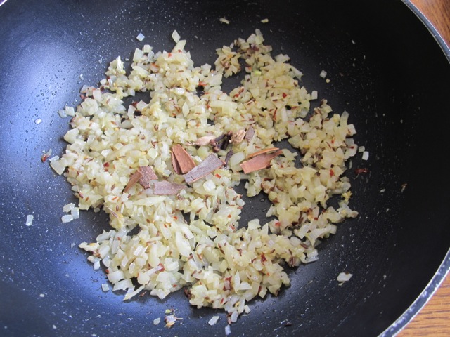 Fry until the onions are soft but not brown then add the cinnamon, cardamom and cloves and fry for 1 minute.