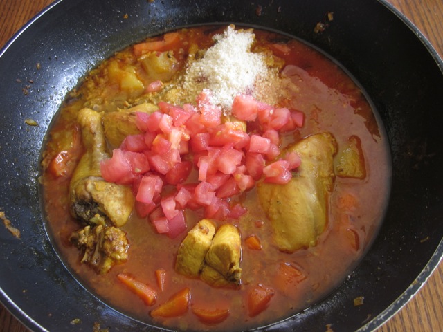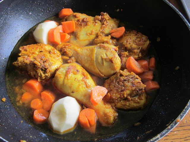 The spices are the basic ones used to make curry or pilau. I used whole cloves, cardamoms, cumin seeds and cinnamon. To the whole spices, I added sweet paprika, turmeric and some tomatoes. Besides enhancing flavour, the turmeric imparts a lovely yellow colour to the chicken. I used a tablespoon of ground almonds to thicken the soup. You can also use ground cashew nuts, or sesame seeds, or any other thickening ingredient you prefer. The stew is best served with some steamed basmati rice or if you prefer, brown rice or quinoa, or any other grain that pleases your palate. You can also serve it with the various flatbreads or even pasta. The suggestions are endless.