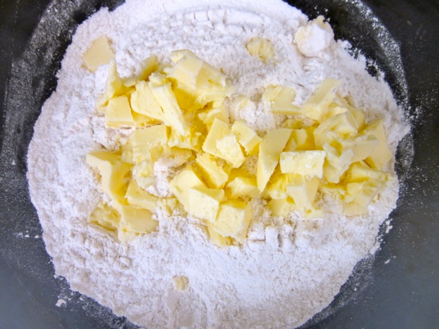 Sift the flour, baking powder and salt into a \ bowl (or flour. Add the cubed butter and rub into the flour briefly, and lightly, using your fingertips, until the mixture resembles fine breadcrumbs.