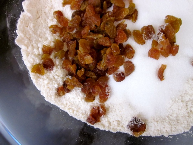 1. Preheat oven to 430℉ (220℃). Line a baking sheet with parchment (greaseproof) paper. Sift the flour, baking powder and salt into a bowl. Add the cubed butter and rub into the flour briefly, and lightly using your fingertips, until the mixture resembles fine breadcrumbs. Add the sugar and sultanas (golden raisins) and stir to combine.
