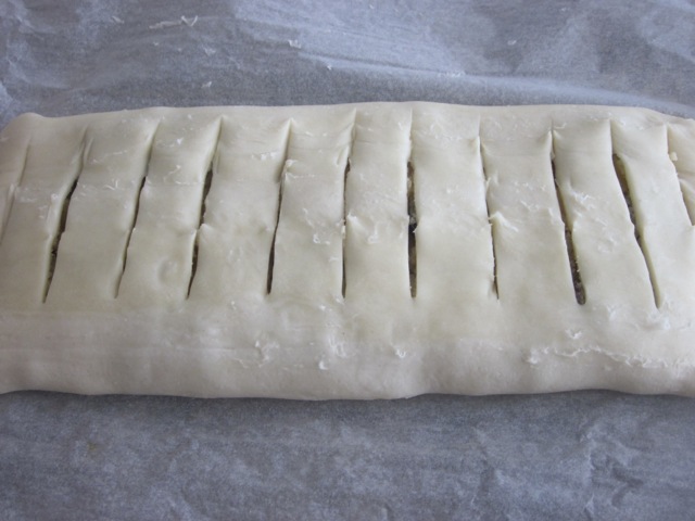 Easy Apple Strudel myfavouritepastime.com_0166Place one sheet of pastry on a flat work surface. Fold in half; make small cuts in the folded edge of the pastry at 2 cm intervals.