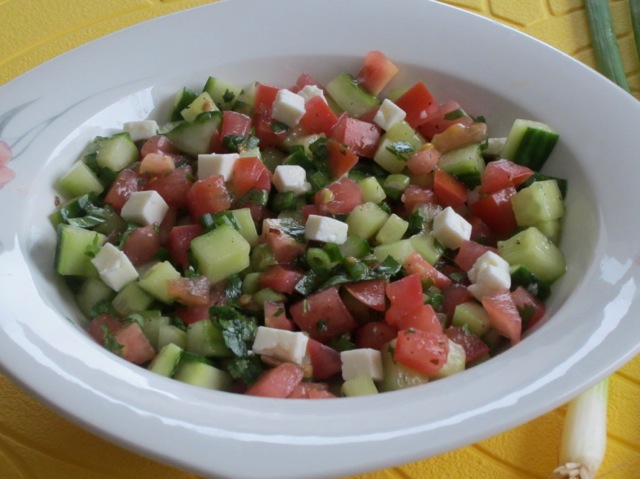 - Mix cucumber, tomatoes and spring onions in a serving bowl.