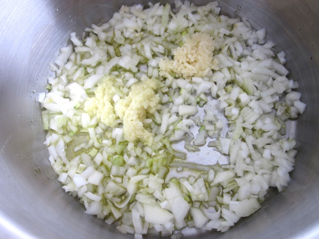 Heat the oil in a large pot over medium heat. Add onions, garlic and ginger and cook five minutes until soft, without browning.