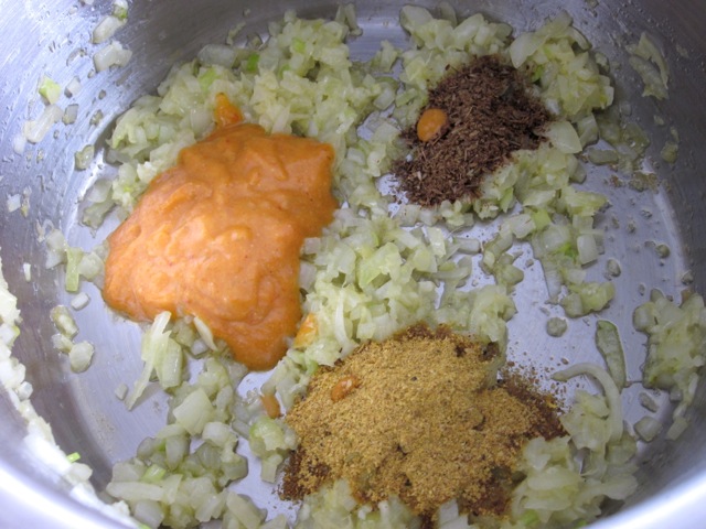 - Heat the oil in a large pot over medium heat. Add onions, garlic and ginger and cook five minutes until soft, without browning. Stir in curry paste, cumin, curry powder and chilli flakes (if using) and cook gently for 3 minutes.