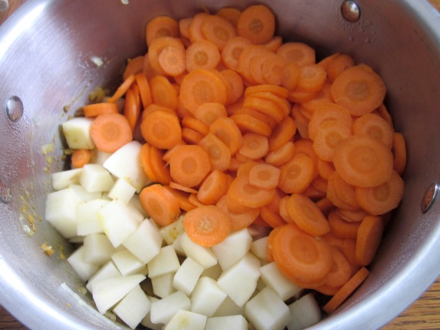 - Add the potatoes and carrots and stir to combine. Stir in 2 cups broth (stock) and the 400ml coconut milk. Increase heat and bring to a boil, stirring occasionally. Reduce the heat to medium-low and simmer for 30 to 45 minutes or until the potatoes and carrots are soft.