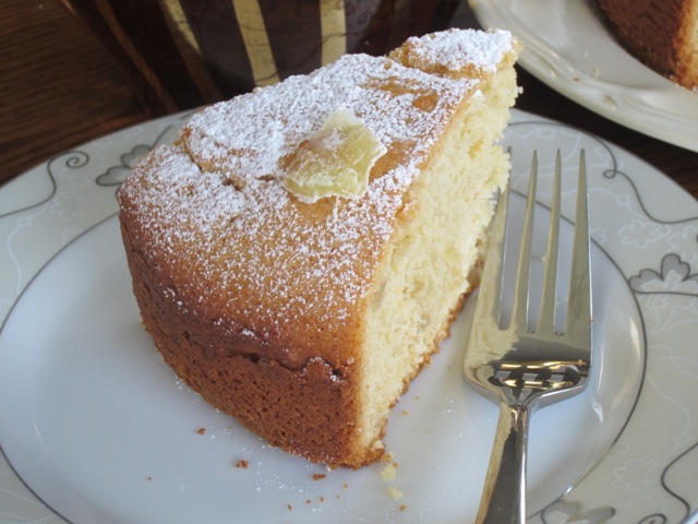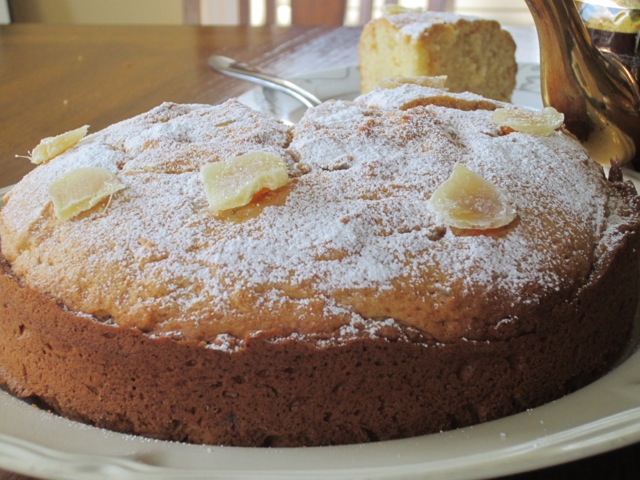I sprinkled some icing (confectioners) sugar and decorated with crystallized ginger. I used a little apricot jam to stick them to the top of the cake.