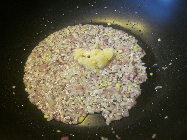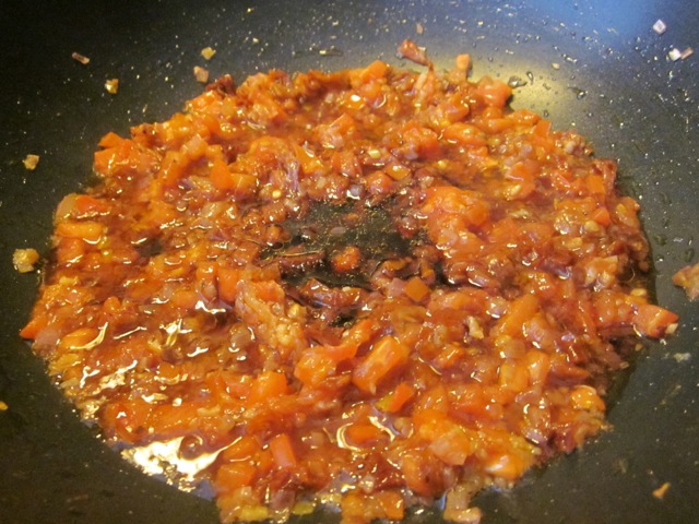 Pasta with Sun-dried Tomatoes and Red Wine myfavouritepastime.com_0701Heat oil in a heavy based pan over medium heat and cook onions until soft. Do not brown. Add garlic and stir for one minute.