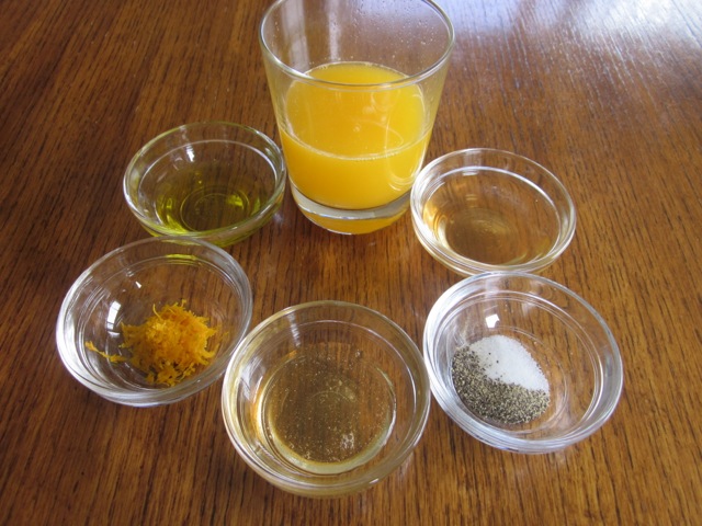 4. To make orange dressing: combine all the dressing ingredients in a bowl and whisk vigorously or pour into an airtight jar and shake thoroughly. Check seasoning.