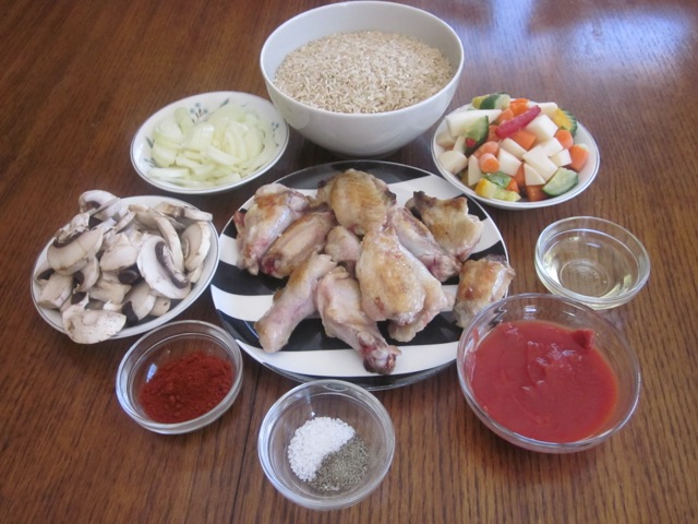 Baked Brown Rice myfavouritepastime.com_0554Add crushed tomato and paprika. Season to taste. Add rice and chicken wings and mix thoroughly.