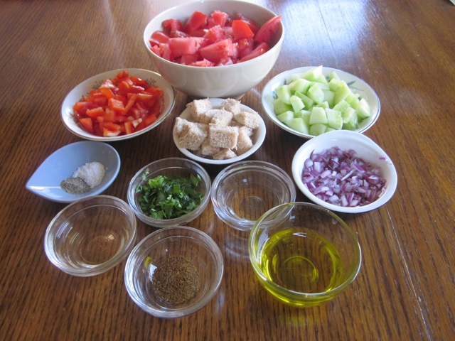 - Place tomatoes, cucumber, red pepper, onion, garlic, cilantro, olive oil and ½ cup of the water in a food processor or blender and place the bread on top. Process until thick and smooth.