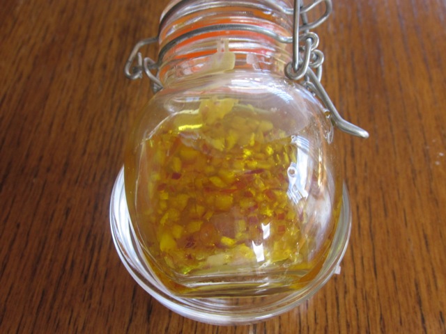 Combine olive oil, vinegar, minced shallots, and mustard in a small jar.