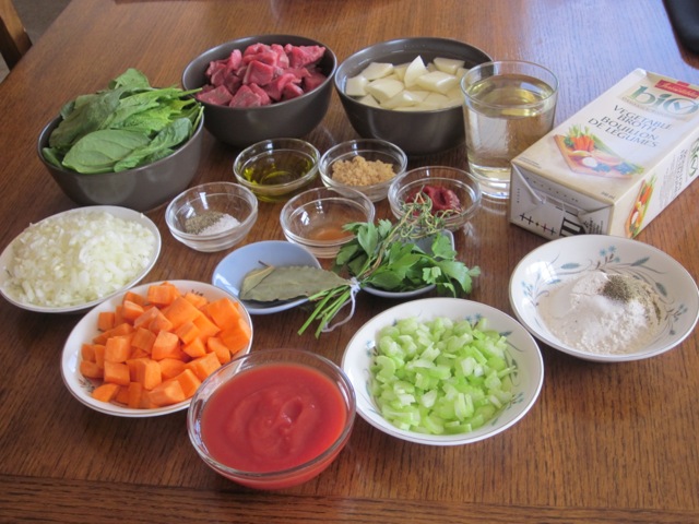 I made this beef stew several weeks ago, with white wine, a sizeable bunch of bouquet garni and vegetables. Bouquet garni is a bundle of herbs, usually tied together with a string or wrapped in a muslin bag and used to prepare stews, casseroles, sauces or stocks. There is no recipe for bouquet garni but it usually consists of parsley, a few sprigs of thyme and a bay leaf. Other herbs or spices that can be included are: basil, chervil, peppercorns, rosemary or tarragon. The bouquet garni is cooked with the food but removed at the end of cooking. The meat is simmered gently for about 1½ hours and some spinach is added just before serving.