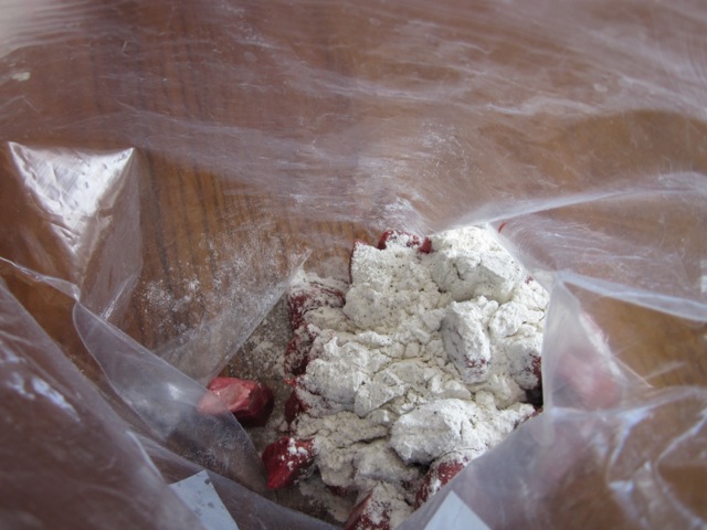 1. Place beef in a ziplock bag. Mix the flour, salt and pepper and pour over beef. Close the bag and shake until completely coated. Shake off excess flour.