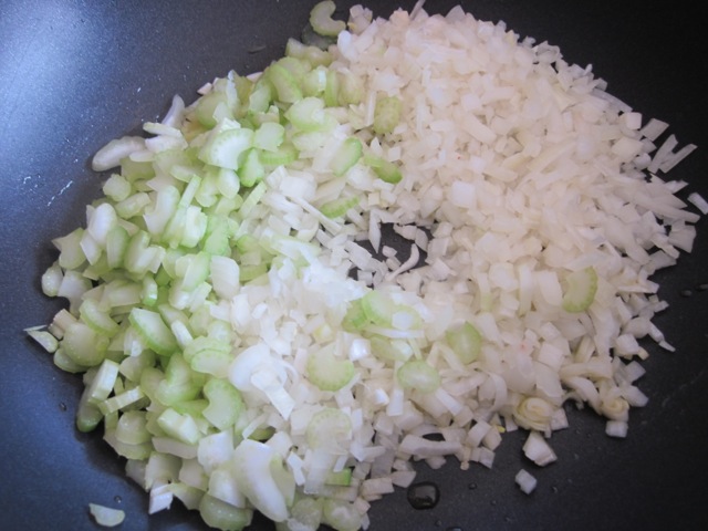3. In the same pan, add the remaining olive oil and cook the onions and celery over gentle heat until soft.