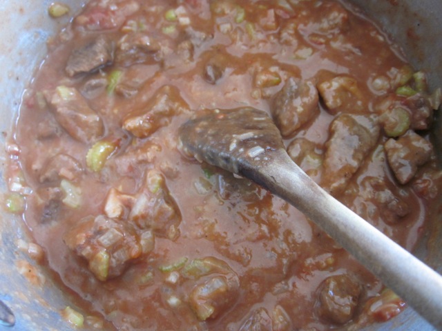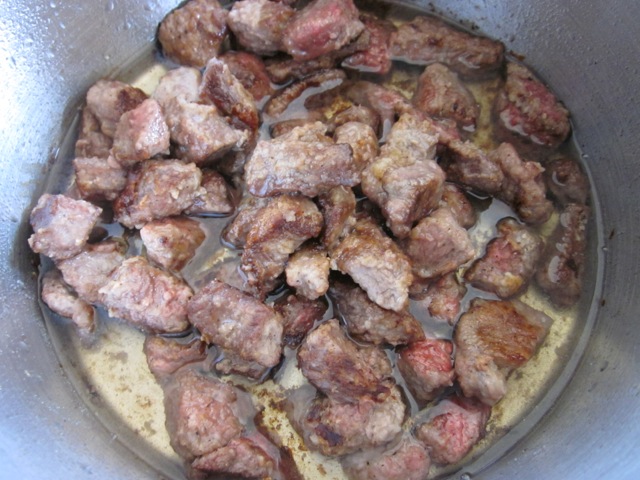 Using a non-stick pot or pan over medium high heat add half the olive oil and brown the beef on all sides in two batches and set aside.