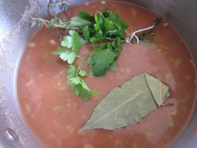 Top with the bouquet garni and bay leaf and bring to the boil, simmer for 1 hour,