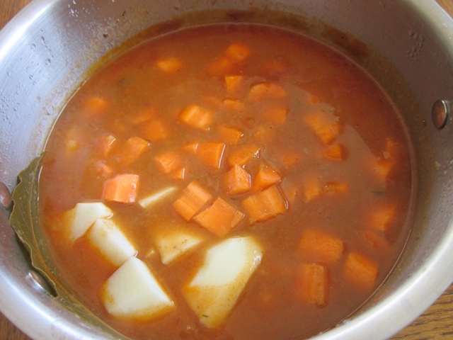 then add the potatoes and carrots and continue simmering until potatoes and carrots are cooked. Check the seasoning and adjust it.