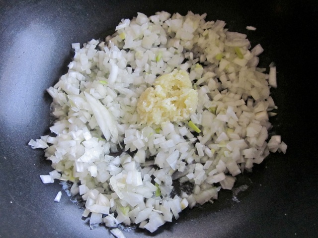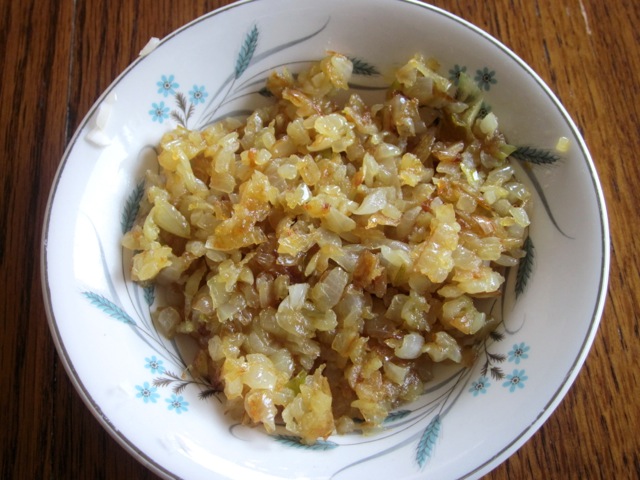 Cook the onions: In the same pan or skillet, melt 1-2 tablespoons butter over medium heat. Stir in onion and garlic, and cook slowly until the onion caramelizes to light brown, about 15 minutes.