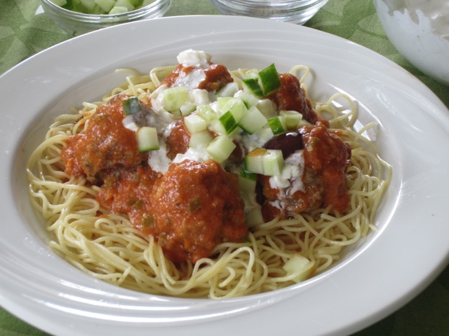 Serve meatballs on a bed of rice, pasta, couscous or your favourite carbohydrate. Top with cucumber and Feta dressing.