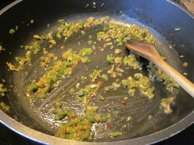 To make the sauce: Heat oil in the same skillet (or just use the rendered fat), and add green pepper, garlic and red pepper flakes.