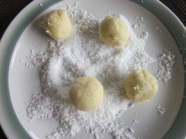 Roll level tablespoons of mixture into balls, press one side of balls firmly into extra sugar and coconut to flatten,