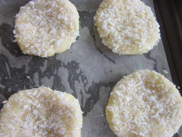 4. Roll level tablespoons of mixture into balls, press one side of balls firmly into extra sugar and coconut to flatten, place them about 4cm apart on the prepared baking sheet.
