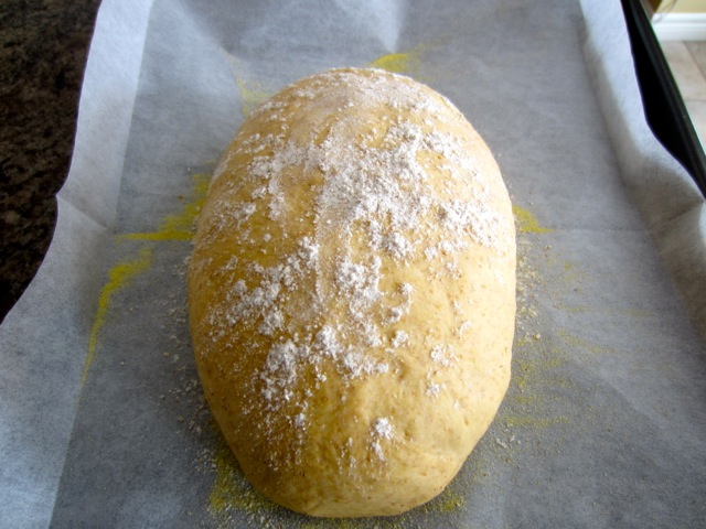 Sweet Potato Bread myfavouritepastime.com_1367Turn out on a lightly floured surface, knock back and knead gently. Shape into an oval 8-inch (20cm) long. Place on the baking sheet and sprinkle the top with whole-wheat flour. Cover the dough with a lightly oiled clear film and leave for 20-30 minutes