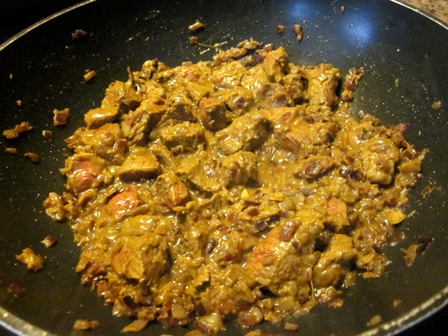 Spicy Fried Beef myfavouritepastime.com_4695Add the water and salt, bring to the boil and simmer 50-60 minutes or until the meat is tender. Add more water if necessary. At the end of the cooking time, the thick spice paste should be clinging to the meat.