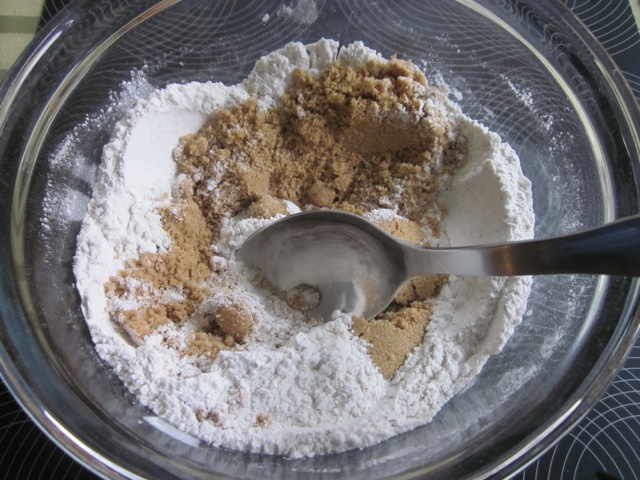 Stir in the brown sugar and form a well in the centre.