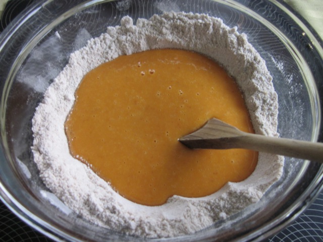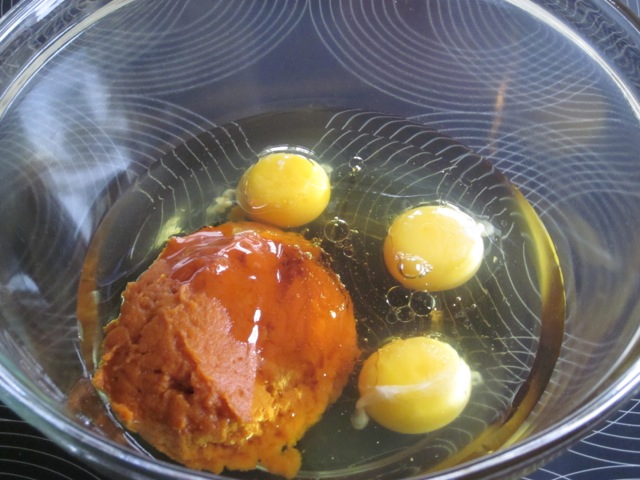In a separate bowl, whisk together the oil, pumpkin puree, golden syrup and eggs