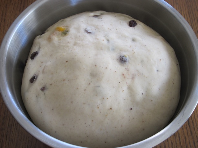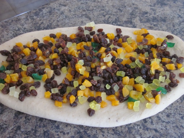 2. Knead in the fruit into the dough and place in a lightly oiled bowl. Cover with cling film (plastic wrap) and leave in a warm place for about 1 hour or until doubled in size.