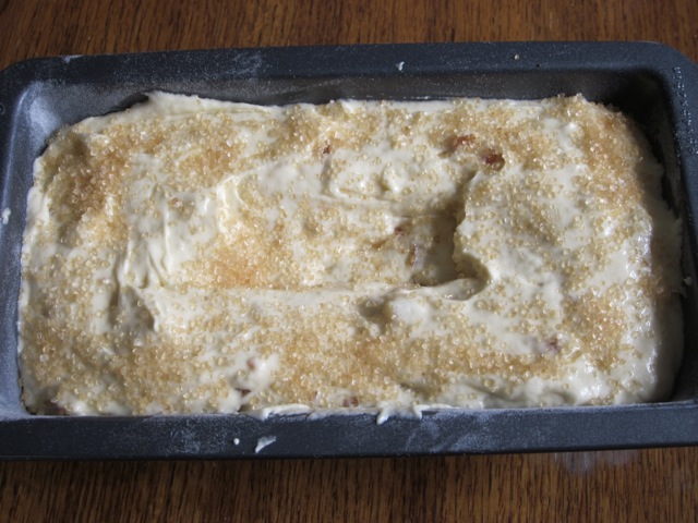 Crunchy Apricot Ginger and Cherry Cake myfavouritepastime.com_4712Spoon mixture into prepared pan, sprinkle half the demerera sugar on to and bake for 60-65 minutes, until golden or until a skewer inserted in the middle comes out clean. (Sprinkle the rest of the sugar on the cake after 40 minutes of baking).