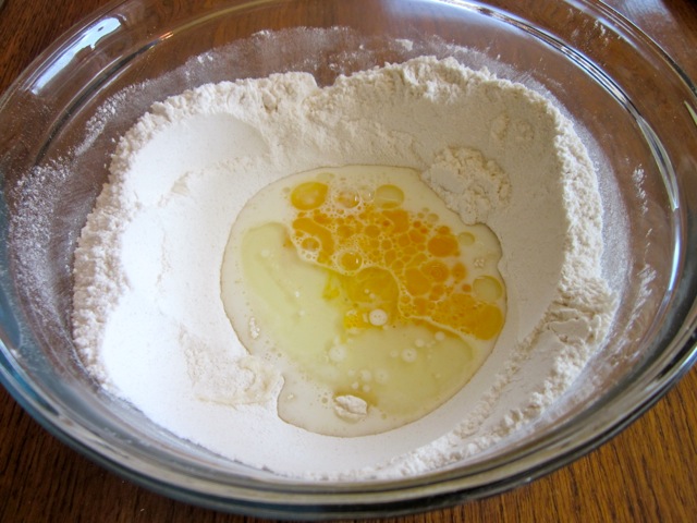 3. Add the milk, egg and canola oil to the well and mix with a spoon until combined. If it seems too dry add a little more milk, a tablespoon at a time until you have a soft dough. Turn over on to a lightly floured surface and knead 8-10 minutes until smooth and elastic.