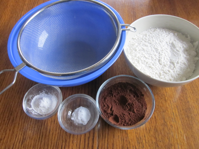 Sift the flour, baking powder, baking soda and cocoa.