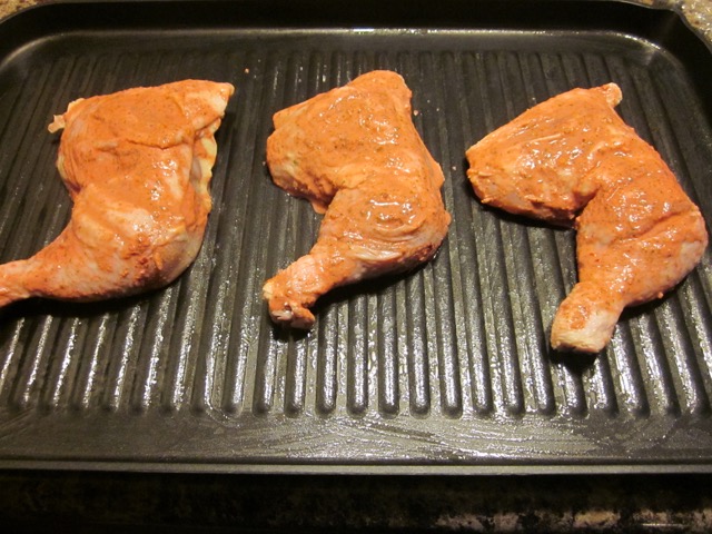 - Place the marinated chicken legs in an oiled anodized double grill and cook in middle rack in the oven for 15 minutes.